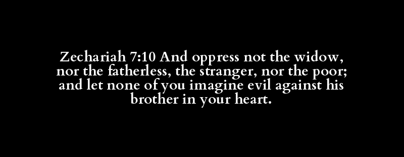 Zechariah 7:10 And oppress not the widow, nor the fatherless, the stranger, nor the poor; and let none of you imagine evil against his brother in your heart.