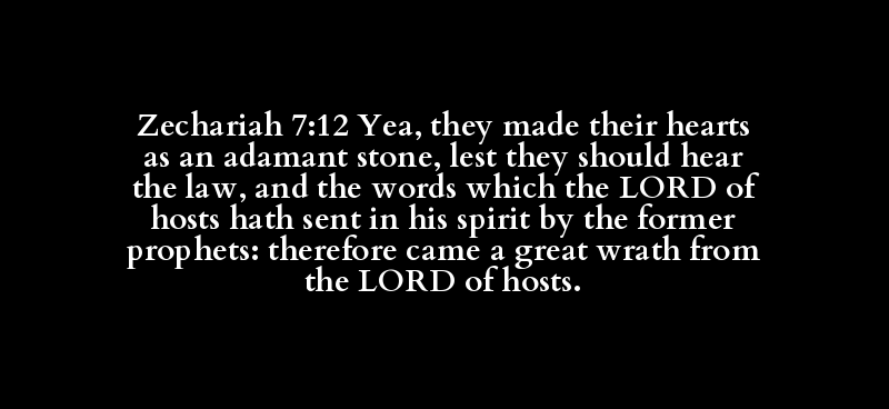 Zechariah 7:12 Yea, they made their hearts as an adamant stone, lest they should hear the law, and the words which the LORD of hosts hath sent in his spirit by the former prophets: therefore came a great wrath from the LORD of hosts.
