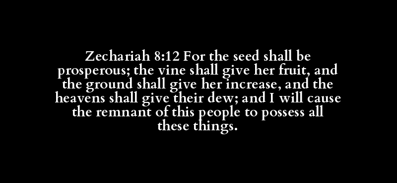 Zechariah 8:12 For the seed shall be prosperous; the vine shall give her fruit, and the ground shall give her increase, and the heavens shall give their dew; and I will cause the remnant of this people to possess all these things.