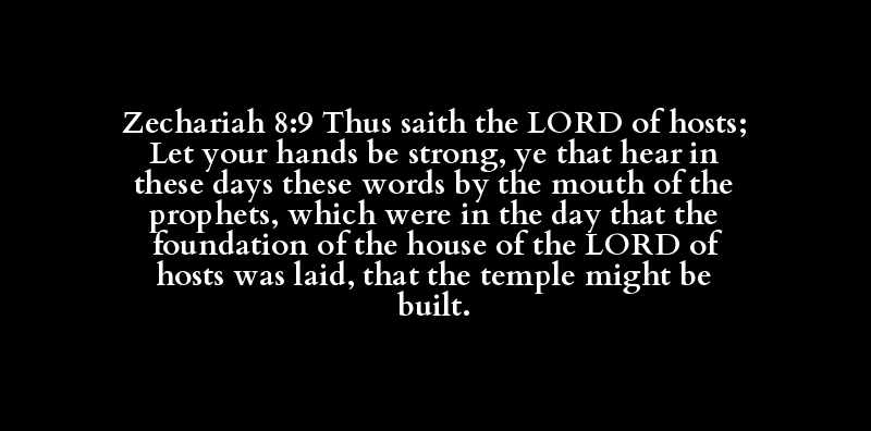 Zechariah 8:9 Thus saith the LORD of hosts; Let your hands be strong, ye that hear in these days these words by the mouth of the prophets, which were in the day that the foundation of the house of the LORD of hosts was laid, that the temple might be built.