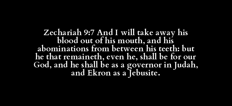 Zechariah 9:7 And I will take away his blood out of his mouth, and his abominations from between his teeth: but he that remaineth, even he, shall be for our God, and he shall be as a governor in Judah, and Ekron as a Jebusite.