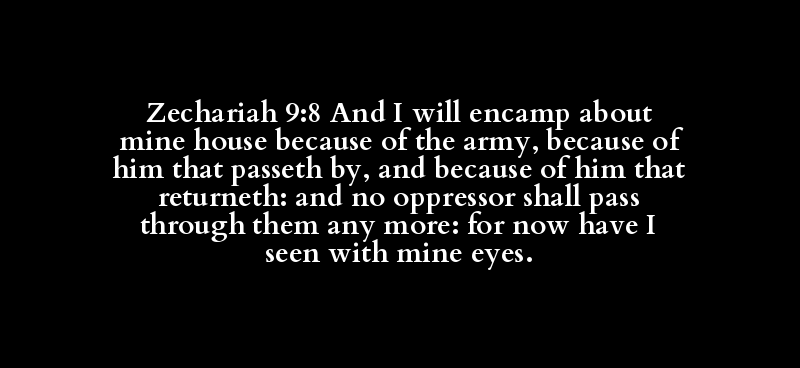 Zechariah 9:8 And I will encamp about mine house because of the army, because of him that passeth by, and because of him that returneth: and no oppressor shall pass through them any more: for now have I seen with mine eyes.