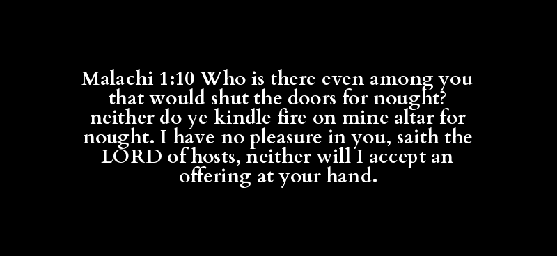 Malachi 1:10 Who is there even among you that would shut the doors for nought? neither do ye kindle fire on mine altar for nought. I have no pleasure in you, saith the LORD of hosts, neither will I accept an offering at your hand.