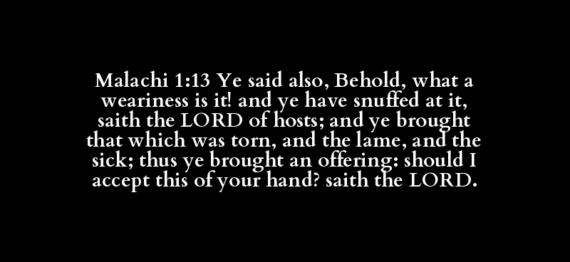 Malachi 1:13 Ye said also, Behold, what a weariness is it! and ye have snuffed at it, saith the LORD of hosts; and ye brought that which was torn, and the lame, and the sick; thus ye brought an offering: should I accept this of your hand? saith the LORD.