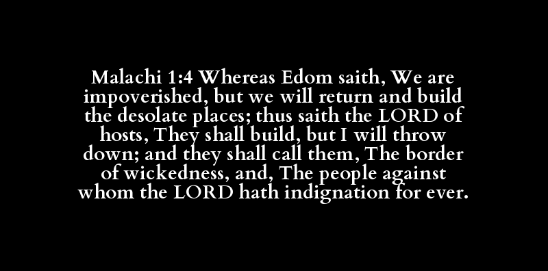 Malachi 1:4 Whereas Edom saith, We are impoverished, but we will return and build the desolate places; thus saith the LORD of hosts, They shall build, but I will throw down; and they shall call them, The border of wickedness, and, The people against whom the LORD hath indignation for ever.