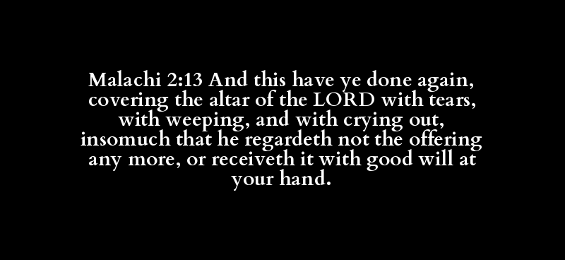 Malachi 2:13 And this have ye done again, covering the altar of the LORD with tears, with weeping, and with crying out, insomuch that he regardeth not the offering any more, or receiveth it with good will at your hand.