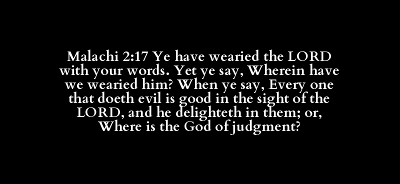 Malachi 2:17 Ye have wearied the LORD with your words. Yet ye say, Wherein have we wearied him? When ye say, Every one that doeth evil is good in the sight of the LORD, and he delighteth in them; or, Where is the God of judgment?
