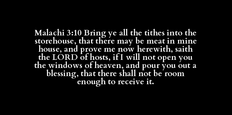 Malachi 3:10 Bring ye all the tithes into the storehouse, that there may be meat in mine house, and prove me now herewith, saith the LORD of hosts, if I will not open you the windows of heaven, and pour you out a blessing, that there shall not be room enough to receive it.