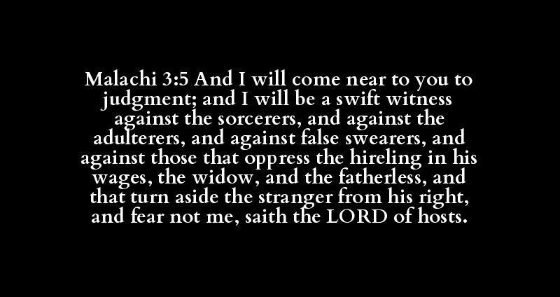 Malachi 3:5 And I will come near to you to judgment; and I will be a swift witness against the sorcerers, and against the adulterers, and against false swearers, and against those that oppress the hireling in his wages, the widow, and the fatherless, and that turn aside the stranger from his right, and fear not me, saith the LORD of hosts.