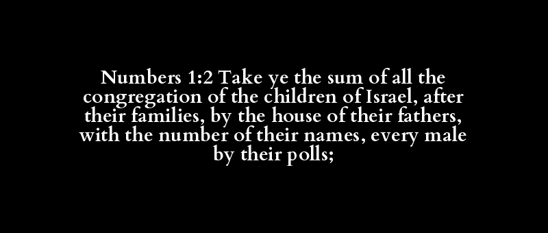 Numbers 1:2 Take ye the sum of all the congregation of the children of Israel, after their families, by the house of their fathers, with the number of their names, every male by their polls;