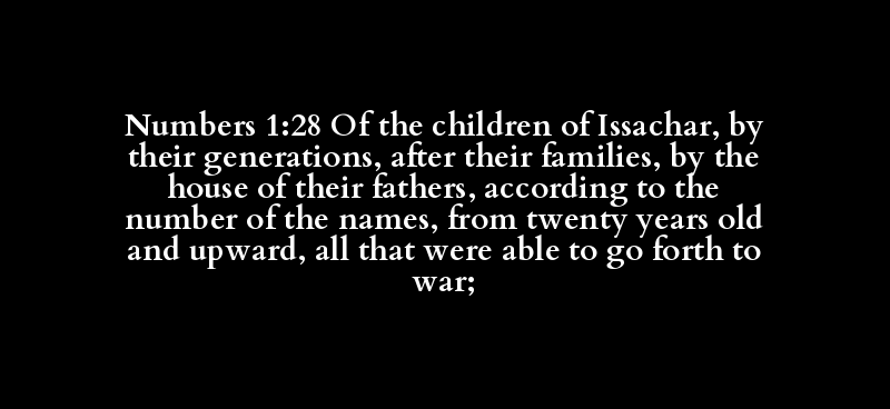 Numbers 1:28 Of the children of Issachar, by their generations, after their families, by the house of their fathers, according to the number of the names, from twenty years old and upward, all that were able to go forth to war;