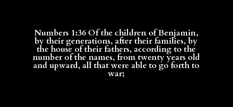 Numbers 1:36 Of the children of Benjamin, by their generations, after their families, by the house of their fathers, according to the number of the names, from twenty years old and upward, all that were able to go forth to war;