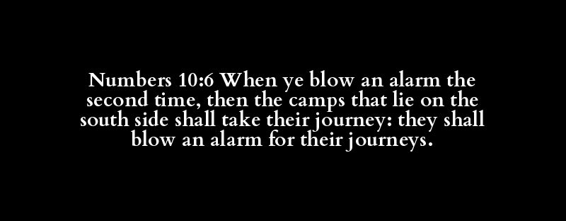 Numbers 10:6 When ye blow an alarm the second time, then the camps that lie on the south side shall take their journey: they shall blow an alarm for their journeys.