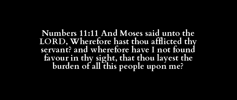Numbers 11:11 And Moses said unto the LORD, Wherefore hast thou afflicted thy servant? and wherefore have I not found favour in thy sight, that thou layest the burden of all this people upon me?