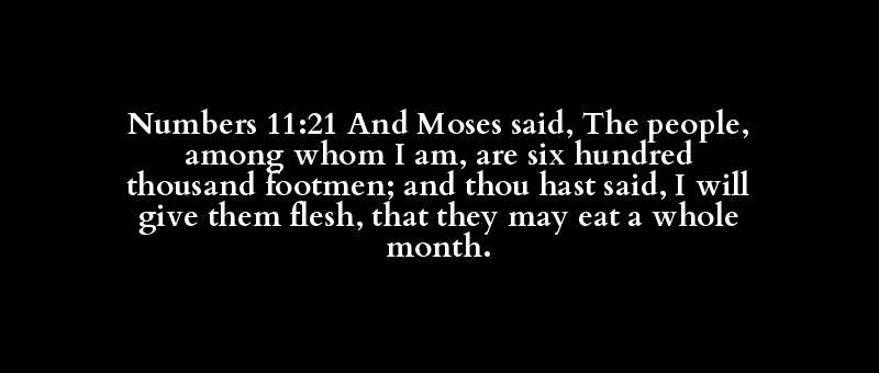 Numbers 11:21 And Moses said, The people, among whom I am, are six hundred thousand footmen; and thou hast said, I will give them flesh, that they may eat a whole month.