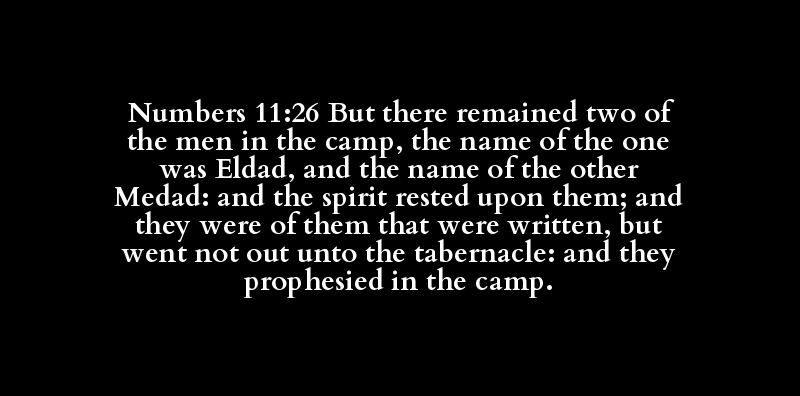 Numbers 11:26 But there remained two of the men in the camp, the name of the one was Eldad, and the name of the other Medad: and the spirit rested upon them; and they were of them that were written, but went not out unto the tabernacle: and they prophesied in the camp.