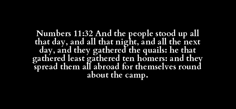 Numbers 11:32 And the people stood up all that day, and all that night, and all the next day, and they gathered the quails: he that gathered least gathered ten homers: and they spread them all abroad for themselves round about the camp.