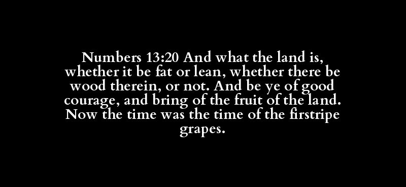 Numbers 13:20 And what the land is, whether it be fat or lean, whether there be wood therein, or not. And be ye of good courage, and bring of the fruit of the land. Now the time was the time of the firstripe grapes.