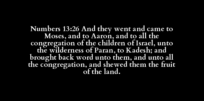 Numbers 13:26 And they went and came to Moses, and to Aaron, and to all the congregation of the children of Israel, unto the wilderness of Paran, to Kadesh; and brought back word unto them, and unto all the congregation, and shewed them the fruit of the land.