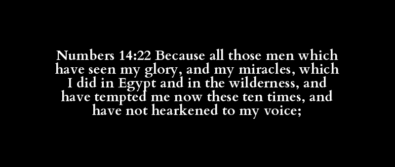 Numbers 14:22 Because all those men which have seen my glory, and my miracles, which I did in Egypt and in the wilderness, and have tempted me now these ten times, and have not hearkened to my voice;