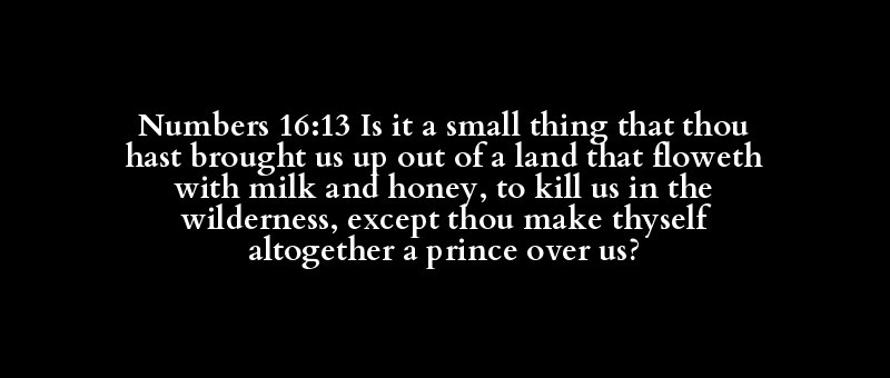 Numbers 16:13 Is it a small thing that thou hast brought us up out of a land that floweth with milk and honey, to kill us in the wilderness, except thou make thyself altogether a prince over us?