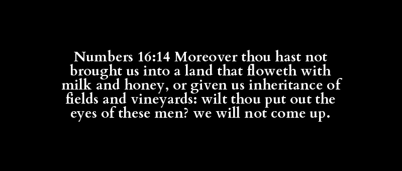 Numbers 16:14 Moreover thou hast not brought us into a land that floweth with milk and honey, or given us inheritance of fields and vineyards: wilt thou put out the eyes of these men? we will not come up.