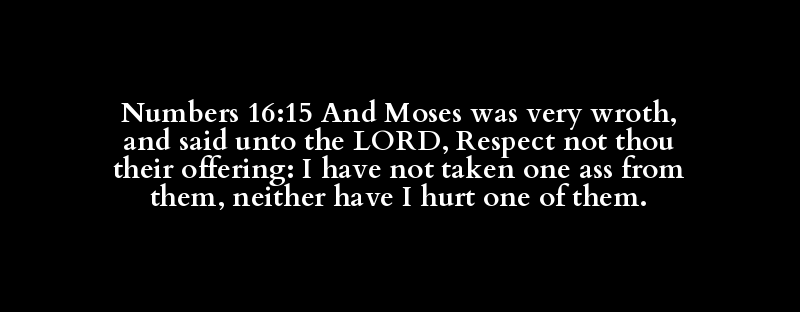 Numbers 16:15 And Moses was very wroth, and said unto the LORD, Respect not thou their offering: I have not taken one ass from them, neither have I hurt one of them.