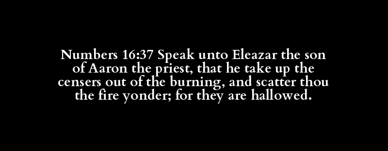 Numbers 16:37 Speak unto Eleazar the son of Aaron the priest, that he take up the censers out of the burning, and scatter thou the fire yonder; for they are hallowed.