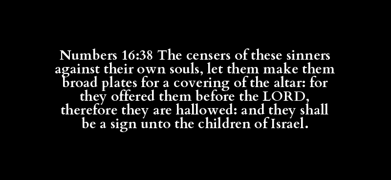 Numbers 16:38 The censers of these sinners against their own souls, let them make them broad plates for a covering of the altar: for they offered them before the LORD, therefore they are hallowed: and they shall be a sign unto the children of Israel.