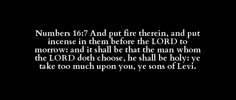 Numbers 16:7 And put fire therein, and put incense in them before the LORD to morrow: and it shall be that the man whom the LORD doth choose, he shall be holy: ye take too much upon you, ye sons of Levi.