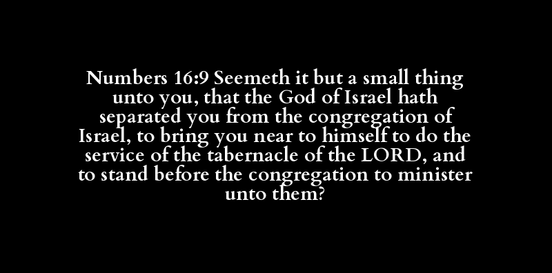 Numbers 16:9 Seemeth it but a small thing unto you, that the God of Israel hath separated you from the congregation of Israel, to bring you near to himself to do the service of the tabernacle of the LORD, and to stand before the congregation to minister unto them?