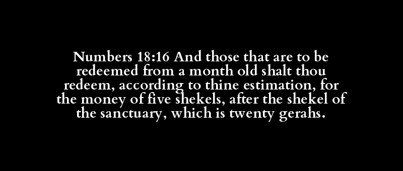 Numbers 18:16 And those that are to be redeemed from a month old shalt thou redeem, according to thine estimation, for the money of five shekels, after the shekel of the sanctuary, which is twenty gerahs.