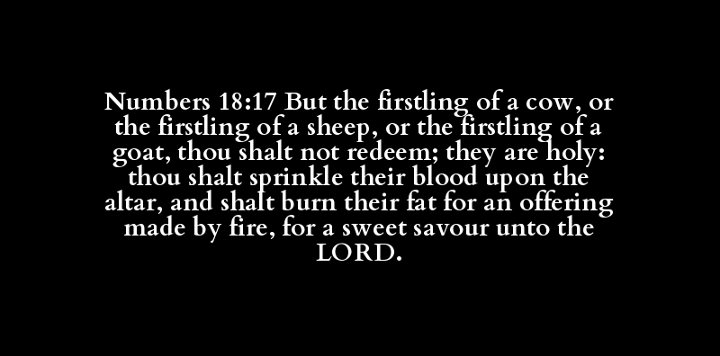 | בְּכוֹר | שׁוֹר | בְּכוֹר | כֶּשֶׂב | בְּכוֹר | עֵז | פָּדָה | קֹדֶשׁ | זָרַק | דָּם | מִזְבֵּחַ | קָטַר | חֶלֶב | אִשָּׁה | נִיחוֹחַ | רֵיחַ | יְהֹוָה |