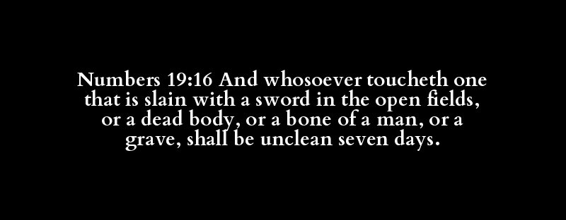 Numbers 19:16 And whosoever toucheth one that is slain with a sword in the open fields, or a dead body, or a bone of a man, or a grave, shall be unclean seven days.