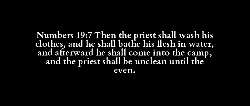 Numbers 19:7 Then the priest shall wash his clothes, and he shall bathe his flesh in water, and afterward he shall come into the camp, and the priest shall be unclean until the even.