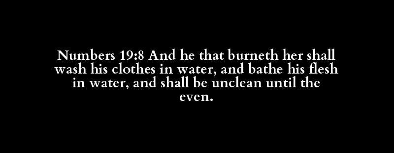 Numbers 19:8 And he that burneth her shall wash his clothes in water, and bathe his flesh in water, and shall be unclean until the even.