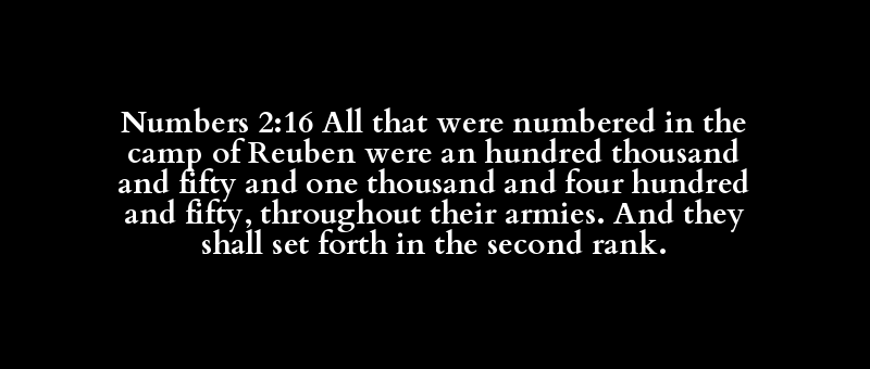 Numbers 2:16 All that were numbered in the camp of Reuben were an hundred thousand and fifty and one thousand and four hundred and fifty, throughout their armies. And they shall set forth in the second rank.
