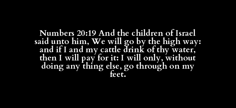 Numbers 20:19 And the children of Israel said unto him, We will go by the high way: and if I and my cattle drink of thy water, then I will pay for it: I will only, without doing any thing else, go through on my feet.