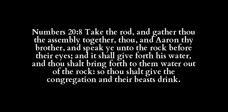 Numbers 20:8 Take the rod, and gather thou the assembly together, thou, and Aaron thy brother, and speak ye unto the rock before their eyes; and it shall give forth his water, and thou shalt bring forth to them water out of the rock: so thou shalt give the congregation and their beasts drink.