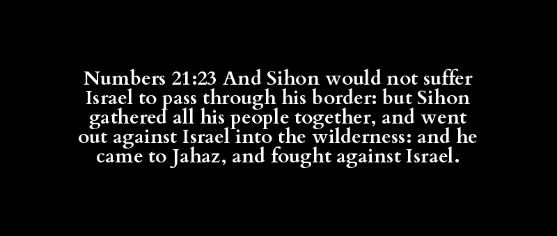 Numbers 21:23 And Sihon would not suffer Israel to pass through his border: but Sihon gathered all his people together, and went out against Israel into the wilderness: and he came to Jahaz, and fought against Israel.