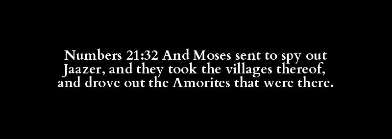 Numbers 21:32 And Moses sent to spy out Jaazer, and they took the villages thereof, and drove out the Amorites that were there.