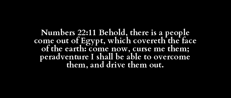 Numbers 22:11 Behold, there is a people come out of Egypt, which covereth the face of the earth: come now, curse me them; peradventure I shall be able to overcome them, and drive them out.