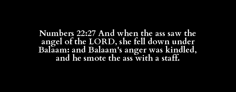 Numbers 22:27 And when the ass saw the angel of the LORD, she fell down under Balaam: and Balaam's anger was kindled, and he smote the ass with a staff.