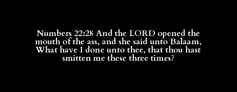 Numbers 22:28 And the LORD opened the mouth of the ass, and she said unto Balaam, What have I done unto thee, that thou hast smitten me these three times?