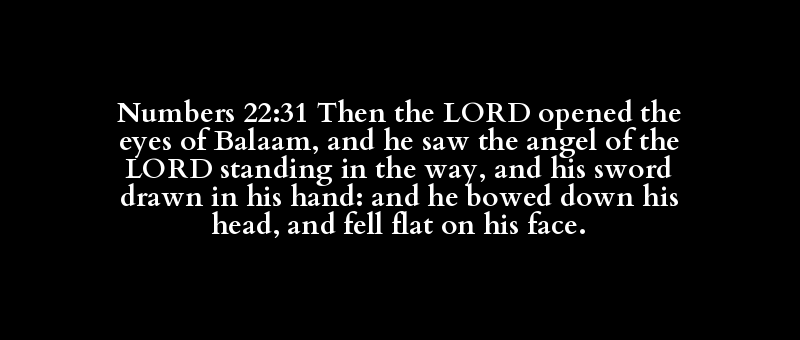 Numbers 22:31 Then the LORD opened the eyes of Balaam, and he saw the angel of the LORD standing in the way, and his sword drawn in his hand: and he bowed down his head, and fell flat on his face.