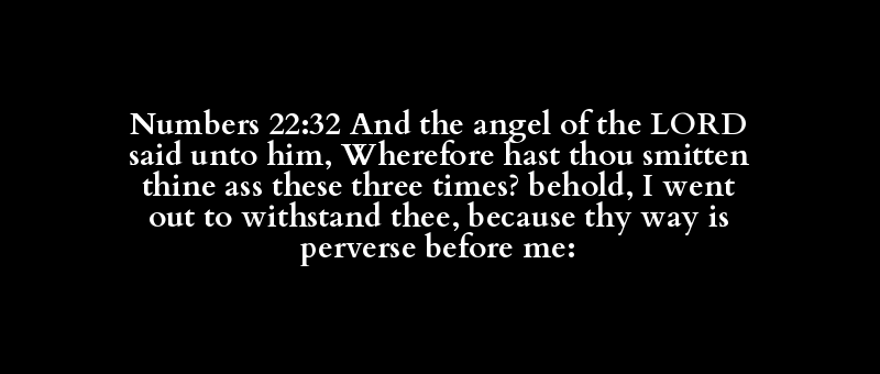 Numbers 22:32 And the angel of the LORD said unto him, Wherefore hast thou smitten thine ass these three times? behold, I went out to withstand thee, because thy way is perverse before me:
