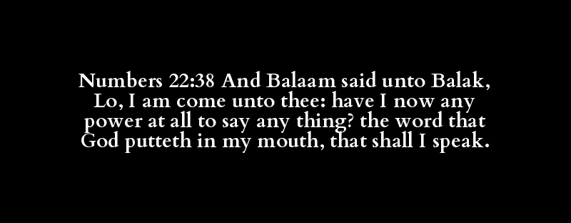 Numbers 22:38 And Balaam said unto Balak, Lo, I am come unto thee: have I now any power at all to say any thing? the word that God putteth in my mouth, that shall I speak.