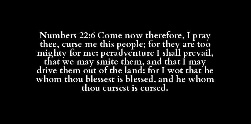Numbers 22:6 Come now therefore, I pray thee, curse me this people; for they are too mighty for me: peradventure I shall prevail, that we may smite them, and that I may drive them out of the land: for I wot that he whom thou blessest is blessed, and he whom thou cursest is cursed.