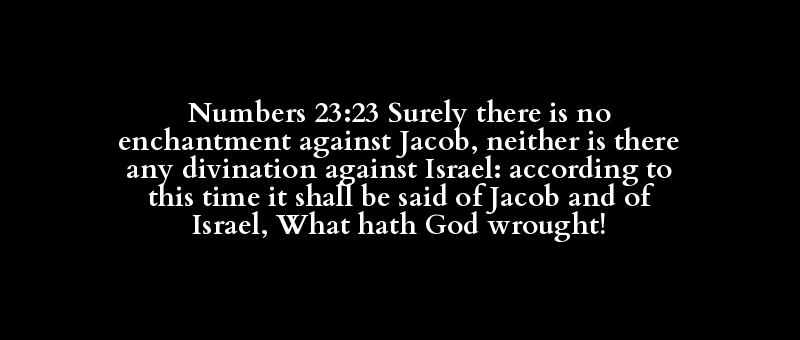 Numbers 23:23 Surely there is no enchantment against Jacob, neither is there any divination against Israel: according to this time it shall be said of Jacob and of Israel, What hath God wrought!