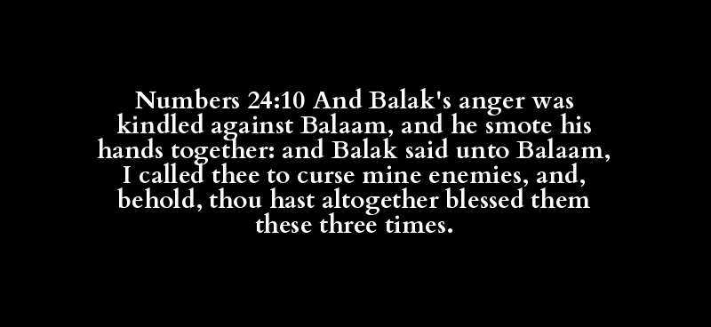 Numbers 24:10 And Balak's anger was kindled against Balaam, and he smote his hands together: and Balak said unto Balaam, I called thee to curse mine enemies, and, behold, thou hast altogether blessed them these three times.